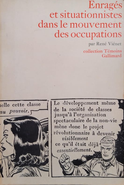Le mouvement de Mai 68 et les situationnistes, par René VIENET, membre de l'Internationale Situationniste; importante iconographie: photos et reproductions de tracts, textes ou bandes dessinées détournées; documents en annexe: textes, tracts, documents divers de Mai ou précurseurs, dont le fameux "De la misère en milieu étudiant considérée sous ses aspects économique, politique, psychologique, sexuel et notamment intellectuel, et de quelques moyens pour y rémédier" publié en novembre 1966. 1ère édition: achevé d'imprimer le 28 octobre 1968 (pas de tirage numéroté), sous couverture ornée de vignettes de comics détournés, une bulle annonçant sur le 1er plat: "Le développement même de la société de classes jusqu'à l'organisation spectaculaire de la non-vie mène donc le projet révolutionnaire à devenir visiblement ce qu'il était déjà essentiellement".