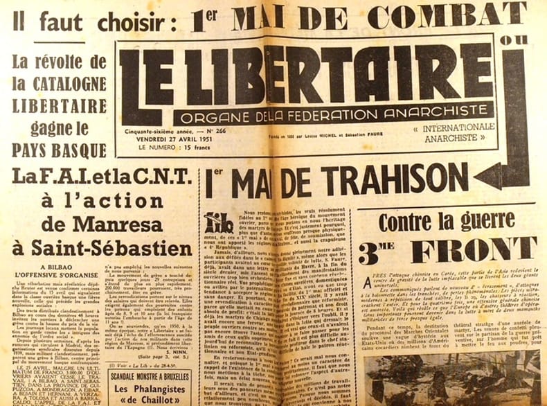 Périodique. La 4e page est une affiche "Jour de fête, non! Jour de combat!". Le Libertaire, 27 avril 1951.
