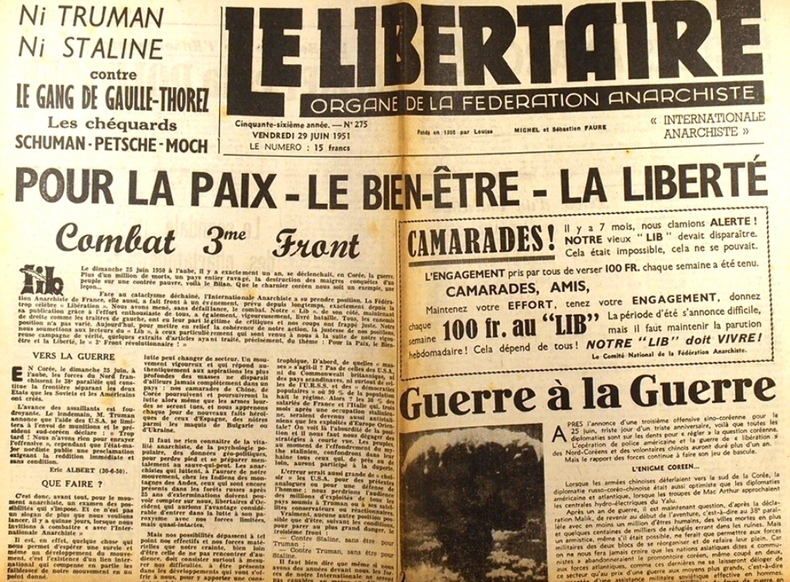 Périodique. La 4e page est une affiche "Les menteurs sont en place". Le Libertaire, 29 juin 1951.