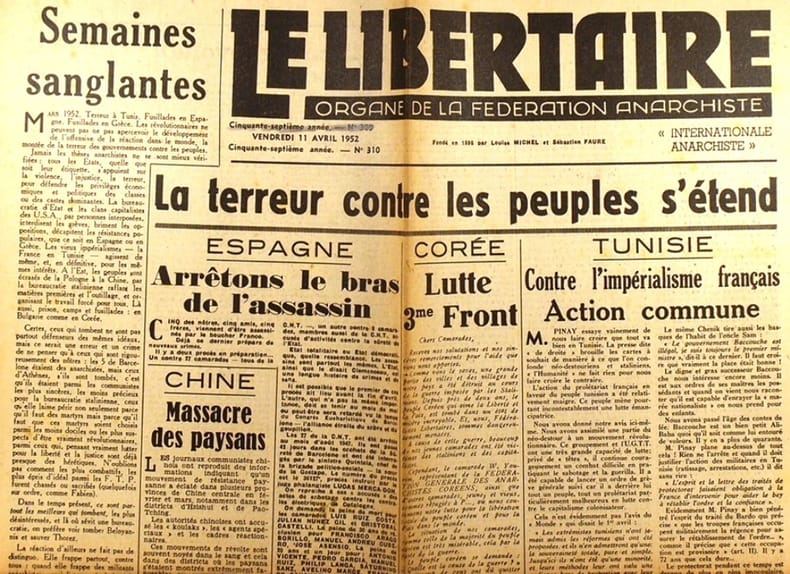 Périodique. La 4e page est une affiche "Comment ils sont morts" sur l'exécution de 5 anarchistes catalans. Le Libertaire, 11 avril 1952.