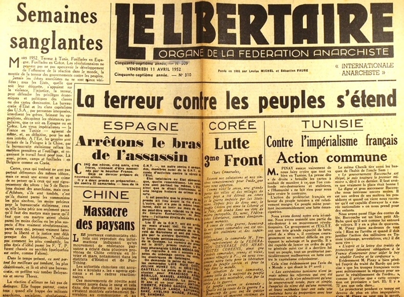 Périodique. La 4e page est une affiche "Comment ils sont morts" sur l'exécution de 5 anarchistes catalans. Le Libertaire, 11 avril 1952.