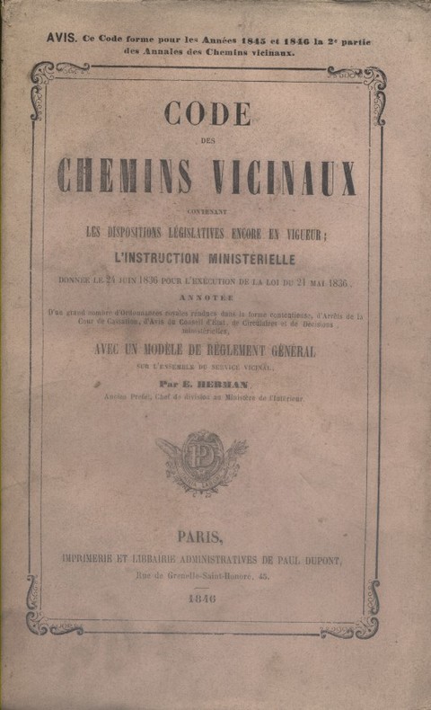Auch, Librairie Brun, rue Napoléon, Paris, Durand, libraire-éditeur, rue des Grés, 7, Paris, Paul Dupont, imprimeur-éditeur, rue de Grenelle-St-Honoré, 45 Relié 1856 "Deux volumes in-12 (11,6 x 18,3 cm), reliure demi-basane, 396 et 227-203 pages, ""Code pratique des chemins vicinaux, d'après le nouveau règlement général, augmenté d'un commentaire, de notes, de modèles, avec le texte des lois, décrets, ordonnances, instructions ministérielles, décisions ou avis du Conseil d'Etat et Arrêts de la Cour de Cassation, applicables au service de la voirie vicinale de 1789 à 1856"" ; dos décolorés, marques d'usage sur les plats, épidermure au mors supérieur du tome 1, par ailleurs assez bon état. Livraison a domicile (La Poste) ou en Mondial Relay sur simple demande."