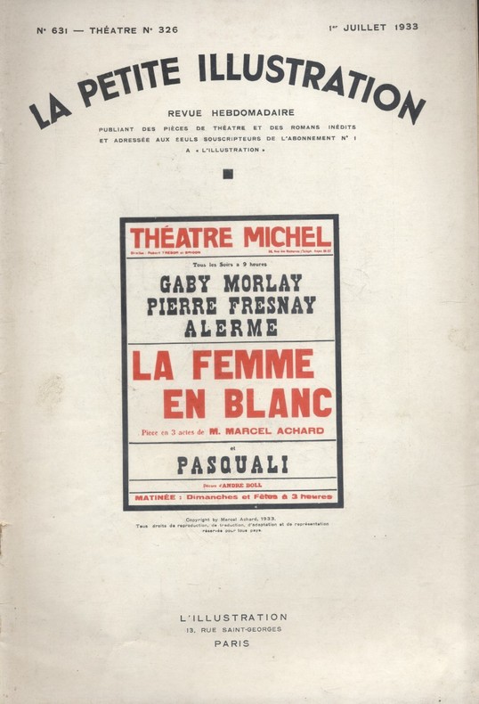 Périodique. Créée en mars 1933 au Théâtre Michel, avec Gaby Morlay et Pierre Fresnay. La Petite Illustration (Collection : Théâtre), 1er juillet 1933.