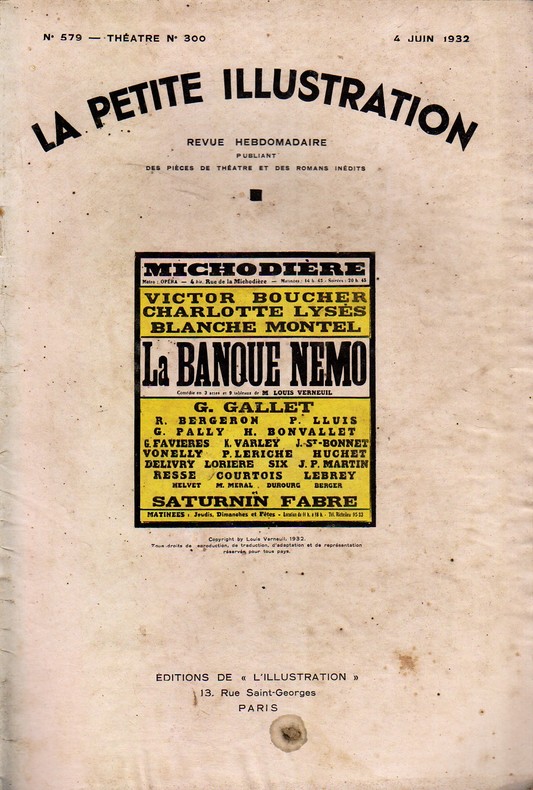 Périodique. Créée en 1931 au théâtre de la Michodière avec Victor Boucher et Saturnin Fabre. La Petite Illustration (Collection : Théâtre), 4 juin 1932.