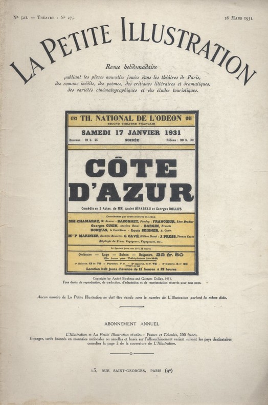 Périodique. Créée en 1931 au théâtre de l'Odéon. La Petite Illustration (Collection : Théâtre), 28 mars 1931.