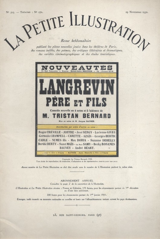Périodique. Créée en 1930 au théâtre des Nouveautés. La Petite Illustration (Collection : Théâtre), 29 novembre 1930.