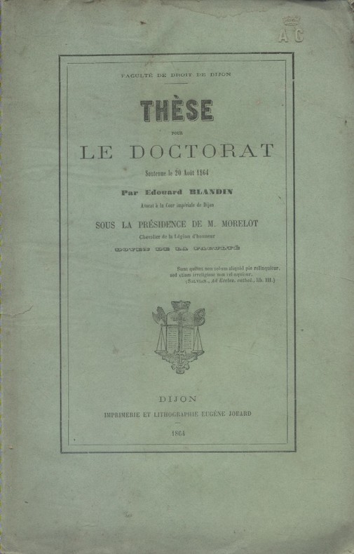 Livre. Faculté de Droit de Dijon. Imprimerie Eugène Jobard. Dijon, 1864. Envoi de l'auteur.