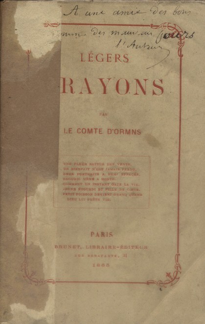 Livre. Editions Brunet, 1865. Envoi de l'auteur sur la couverture.