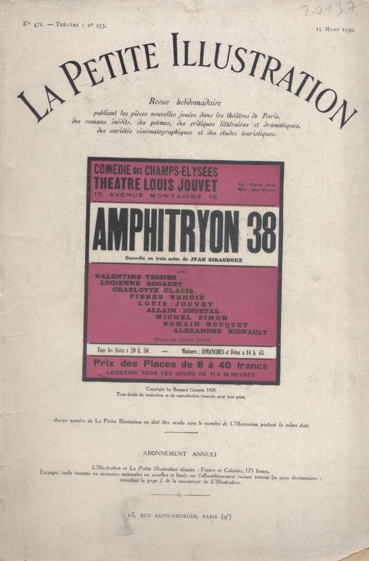 Périodique. Créée en 1929 au théâtre des Champs-Elysées, mise en scène de Louis Jouvet. La Petite Illustration (Collection : Théâtre), 15 mars 1930.