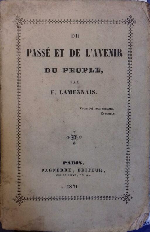 Retirage de ce recueil de textes de l'ex-prêtre Félicité de LA MENNAIS (1782-1854) publiés après le ralliement à la cause démocratique de leur auteur: "Paroles d'un croyant" (publié en 1834) ayant entraîné sa condamnation par l'Eglise, et sa rupture définitive avec elle: il sera représentant du peuple à l'Assemblée constituante en 1848 et député à l'Assemblée législative en 1849-1851; "Le Livre du peuple" (publié en 1838); "Une voix de prison", recueil de courts textes composés dans la prison de Sainte-Pélagie en 1841; "Du Passé et de l'avenir du peuple" (1841); "De l'esclavage moderne" (1839; ici avec préface de l'auteur à une "nouvelle édition", non datée). Exemplaire relié.