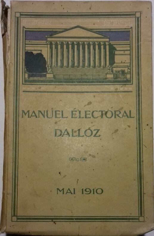 "DALLOZ. 1910. In-12. Broché. Etat d'usage, Couv. convenable, Coiffe en tête abîmée, Quelques rousseurs. VIII + 472 pages - une coupure de presse ""questions électorales"" collée sur le 2ème contre plat - tranches jaspées.. . . . Classification Dewey : 348-Lois, règlement, jurisprudence"