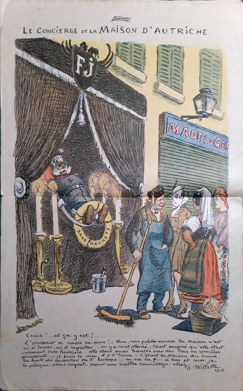 16 PAGES-30 CM X 23 CM-COUVERTURE PAR TANCREDE SYNAVE, FRANCOIS-JOSEPH DANS LANDAU-"PAS DE PAIX SEPAREE", BENJAMIN RABIER, PLEINE PAGE NOIR ET BLANC-"LE DOUBLE MONARQUE", PIERRE LEGRAIN, PLEINE PAGE COULEURS, FRANCOIS JOSEPH AVEC CHEVAL A ROULETTES-DESSIN NOIR ET BLANC DE DELAW-"LUNE ROUSSE", METIVET, PLEINE PAGE NOIR ET BLANC-"LE CONCIERGE DE LA MAISON D'AUTRICHE", WILLETTE, DOUBLE-PAGE COULEURS-"EXPLICATIONS", MEUNIER, PLEINE PAGE NOIR ET BLANC-"LE DERNIER PAQUEBOT AUTRICHIEN A TRIESTE", GRANDJOUAN, PLEINE PAGE COULEURS-"LES EMOTIONS DE FRANCOIS GAGA", HENRIOT, 9 DESSINS, 1P-"LE REMORDS", HUARD, PLEINE PAGE NOIR ET BLANC-EN 4 DE COUVERTURE "LE BRILLANT SECOND", ABEL TRUCHET, PLEINE PAGE COULEURS