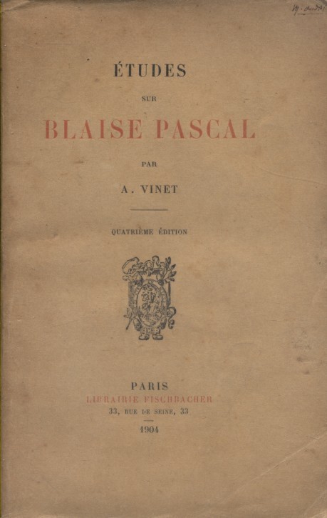 2è édition de ce recueil d'"études" d'Alexandre Vinet, théologien protestant et critique littéraire suisse (1797-1847), sur Blaise Pascal (1623-1662), publiées en 1848: édition où est modifié l'ordre des textes, et qui est augmentée du "premier morceau [cours donné à Bâle en 1833], rétabli d'après les notes de M. Vinet et les cahiers de ses auditeurs" (in "avertissement des éditeurs"). Exemplaire assez vilain mais avec mention manuscrite sur la 1ère garde indiquant les noms de ses premiers propriétaires, missionnaires à Hébron (au Lessouto en Afrique du Sud): M. Cochet en 1857 puis Marcel Debard en 1929 - ce dernier semblant, d'après la signature, l'auteur de ces précisions - et enrichi d'un manuscrit ancien de 4 pages daté d'Hébron, 1857 (du M. Cochet suscité ?).