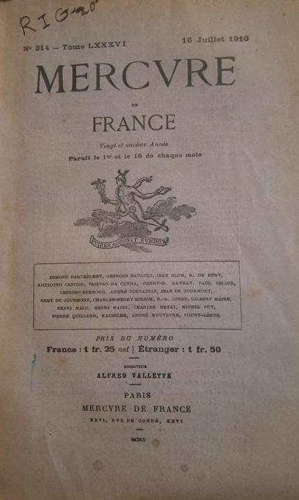Dir. : Alfred Vallette. P., 1910, in-8, br. Textes de P. Delior "La femme et le sentiment de l'amour chez Stéphane Mallarmé", A. Rouveyre (dessin), G. Batault, G. Maire, R. et J. de Gourmont, Rachilde, G. Eekhoud, R. Canudo, etc.