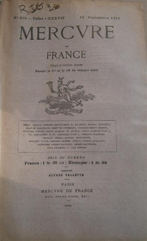 Périodique. Mercure de France, 16 septembre 1910.