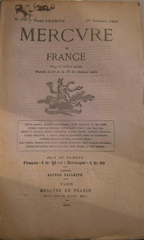 Dir. : Alfred Vallette. P., 1910, in-8, br. Textes de J.-J. Rousseau "le Nouveau Dédale", A. Erlande, J. Bertaut, T. Carlyle, R. et J. de Gourmont, van Gennep, G. Eekhoud, etc.