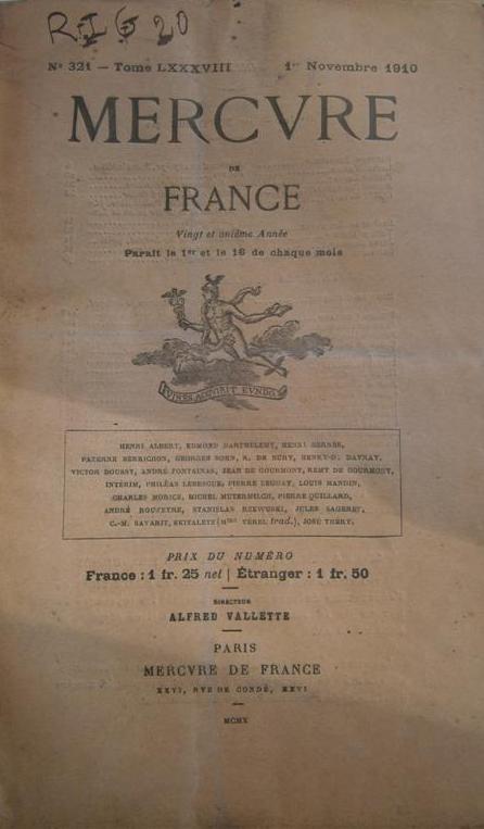 Périodique. Mercure de France, 1er novembre 1910.