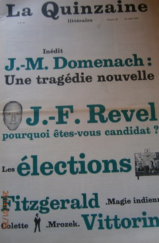 Au sommaire : J.M. Domenach : une tragédie nouvelle, J.-F. Revel, les élections, Fitzgerald, Magie indienne, Colette, Mrozek, Vittorini, etc.