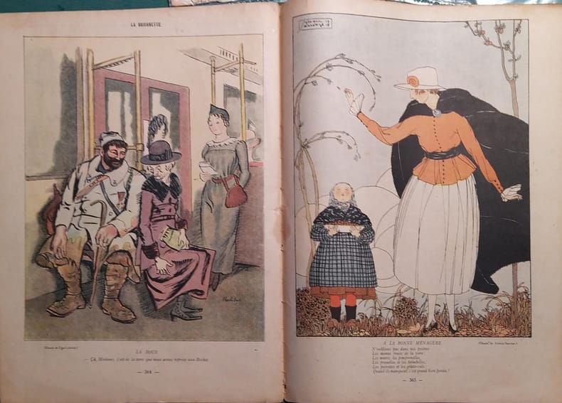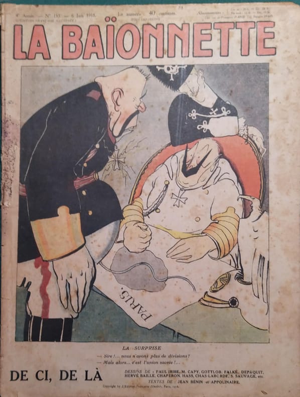 Périodique. Textes de Robert Francheville et Pierre Mac Orlan. Couverture illustrée par Paul Iribe. La Baïonnette, 1918.