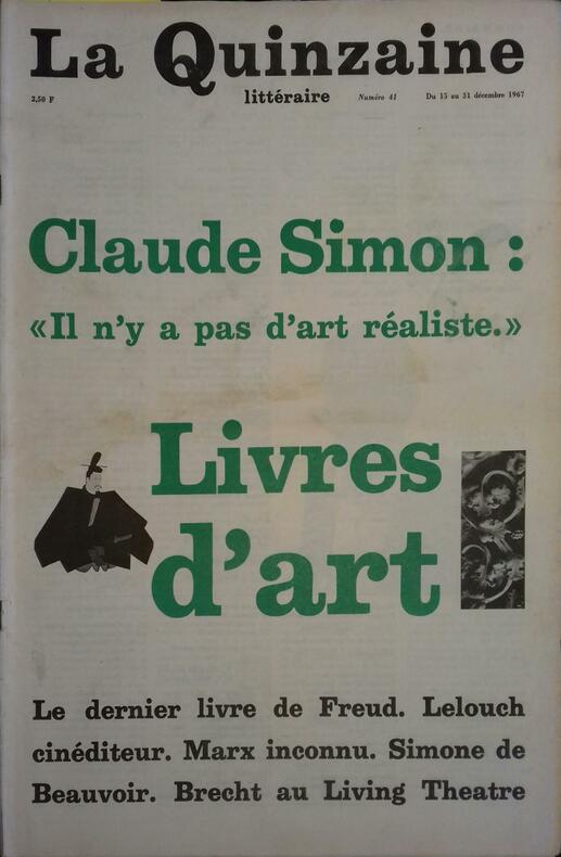 Sommaire : Une écriture de désir et de mort par Henri Ronse, Claude Simon : il n'y a pas d'art réaliste par Madeleine Chapsal, A mi-voix par Maurice Nadeau, La Grèce avant la dictature par Jean Gaugeard, Recherches romanesques par Dominique Noguez Classification Dewey : 809-Histoire, littérature