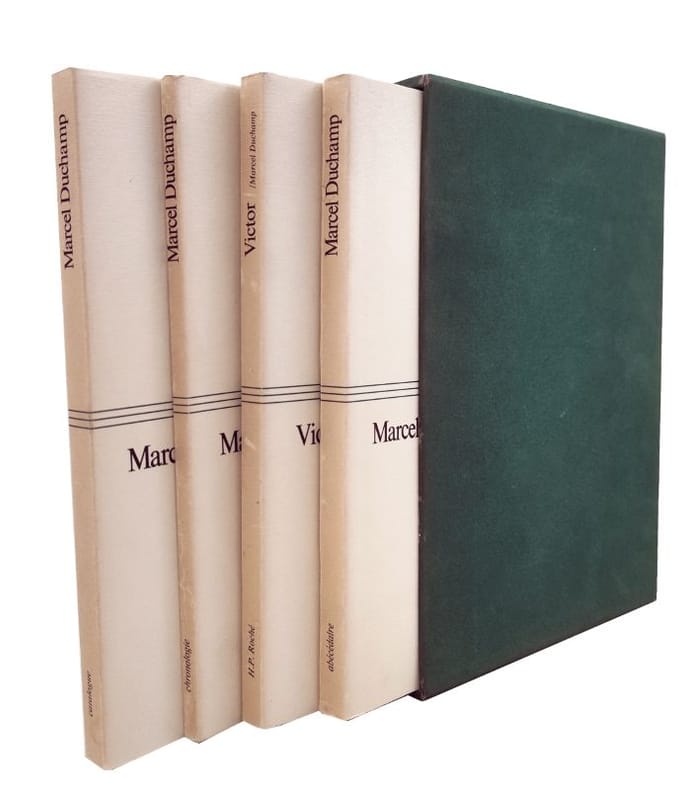 Paris Centre Pompidou 1977 Quatre volumes brochés sous coffret vert d'origine. Vol. 1 : Chronologie générale. Vol. 2 : Catalogue raisonné rédigé par Jean Clair. Vol. 3 : Abécédaire, approches critiques. Vol. 4 : H.P. Roché, Victor / Marcel Duchamp. Nombreuses contributions, très importante iconographie. Dos légèrement brunis.(100596)