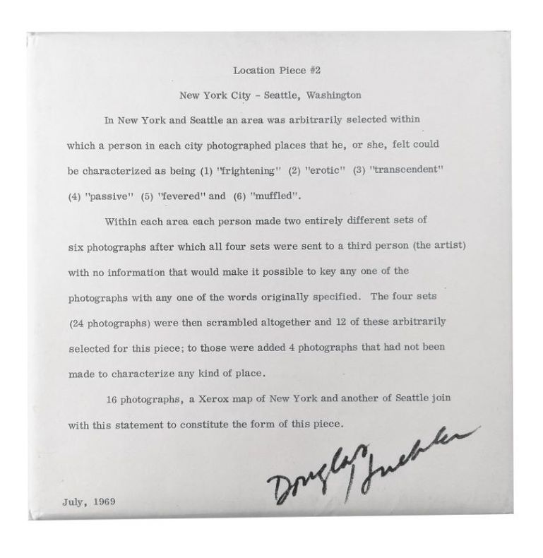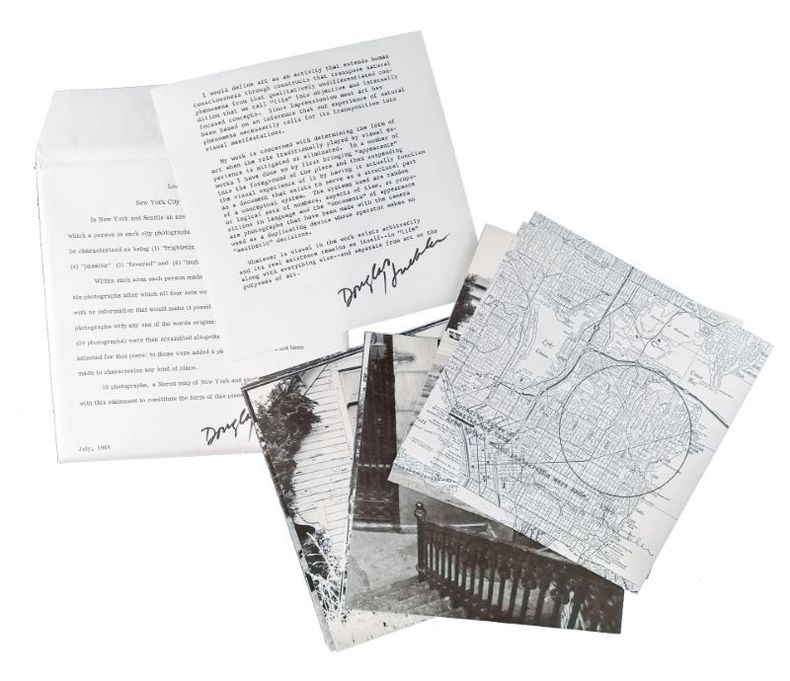 1970 New York, Multiples, 1970, 190x190mm, enveloppe imprimée contenant 19 documents. Documentation relative à une action d’environnement ayant pris place à New York City, Seattle et Washington. Publié à 1200 exemplaires comme partie de la boîte « Artists and Photographs ». Moeglin-Delcroix 2011, p.171. (101524)