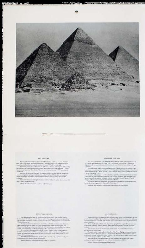 1972 Londres, Studio International Publications Ltd, 1972, 27x30.7cm, 22 pages non paginées sous couverture souple, broché, présenté comme un calendrier mural, un trou en bas de la couverture permettant de le suspendre, ouvert à la page désirée, à un clou planté au mur.10 photographies pleine page accompagnées chacune d'un texte en quatre langues. Premier livre d'artiste de l'auteur qui avait auparavant exposé ces "paraboles" à la galerie Konrad Fischer à Dusseldorf. Etat neuf. Moeglin-Delcroix 2011, p.316, reproduit. GRPC 203.(101662)