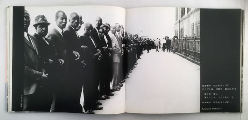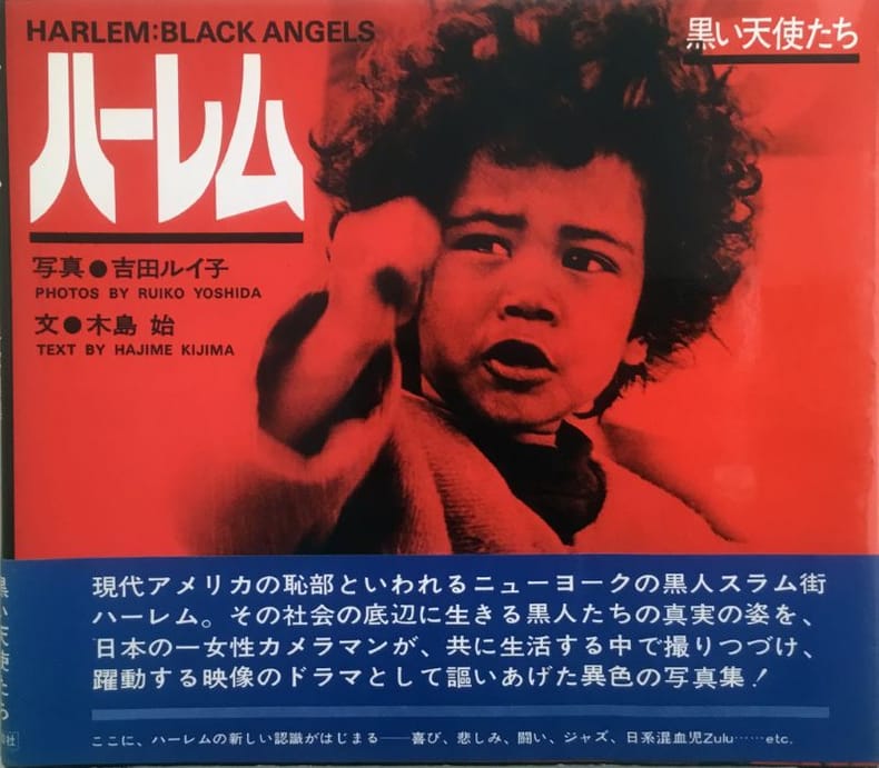 Yoshida commence une brillante carrière dans la diffusion internationale de NHK, mais quitte le travail pour les études aux Etats-Unis en 1962. Inspirée par les photographies d’Eugene Smith, elle commence à prendre les photos dans Harlem où elle habitait avec son mari (‘blanc’), professeur de l’Université Columbia. Elle retourne au Japon en 1971, publie d’abord un photo-essai sur les problèmes de la société américaine avec les noirs. Son second livre sur les noirs américain, le « Black Angels » est un hommage franc des noirs qu’elle a connus, exprimé à travers un petit garçon nommé Zulu. « Black is Beautiful » le message émane de ses photographies présentant les petites gens, des bandes de gosses, le funérailles de Malcolm X, Angela Y. Davis, les musiciens du Jazz comme Dizzy Gillepie, Roberta Flack, Ray Charles, Miles Davis, Ornette Coleman, et John Coltrane…Édition originale, second tirage d'avril 1974 (après mars 1974). Bel exemplaire.(101910)