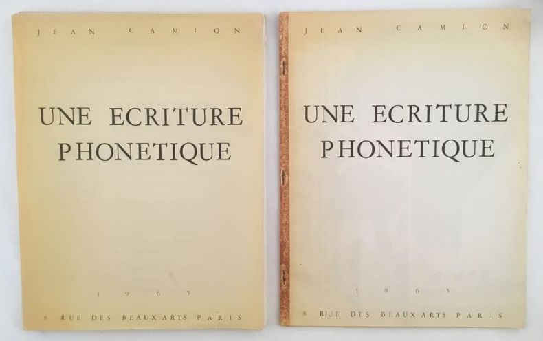 Paris, Chez l'auteur, 8, rue des Beaux Arts, vers 1960, 270x210mm, deux volumes: -42 feuillets non reliés imprimés recto seul, dont le titre, 7 feuillets non numérotés et 35 feuillets numérotés de 1 à 35. Textes et bibliographie. -un cahier de planches comportant un titre, 14 planches dont deux dépliantes, irrégulièrement numérotées, une feuille blanche, agrafé. Textes ronéotés, planches imprimées par un procédé de duplication. Architecte, inventeur et linguiste Jean Camion s'attaque ici à la réduction de l'écriture traditionnelle française, jugée trop compliquée, à un système de phonèmes dont il établit la classification et la transcription sur des portées musicales à l'aide d'une machine orthophonique de son invention. (102005)