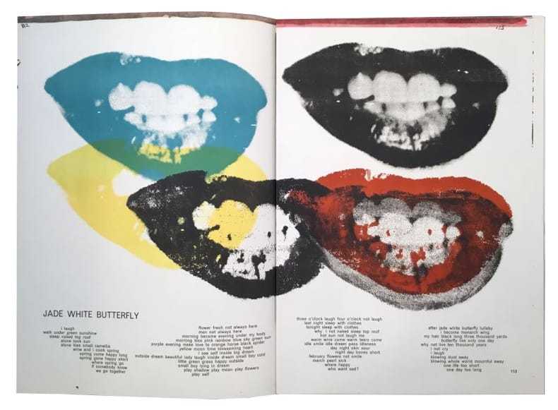 Les poèmes de Walasse Ting, imprimés en couleurs se trouvent en regard des 62 lithographies originalesde : Walasse Ting (6 lithos); Pierre Alechinsky (5 lithos); Karel Appel (5 lithos); Enrico Baj (2 lithos); Alan Davie (2 lithos), Sam Francis ( Pink Venus Kiki + 5 other lithos); Robert Indiana (2 lithos); Asger Jorn (2 lithos); Roy Lichtenstein (Cover + 1 litho); Joan Mitchell; Claes Oldenburg (3 lithos: Parade of Women + All Kinds of Love 1 & 2 ); Mel Ramos (2 lithos), Robert Rauschenberg (2 lithos), Joan Mitchell, Allan Kaprow, Rinehound, Jim Dine, Jean-Paul Riopelle, James Rosenquist; Antonio Saura, Kimber Smith, K.R.H. Sonderberg, Bram Van Velde, Oyvind Fahlstrom, Andy Warhol, and Tom Wesselmann (2 lithos). Édition limitée à 2200 exemplaires. Exemplaire n° 1561 numéroté au colophon. (103644) Très bon