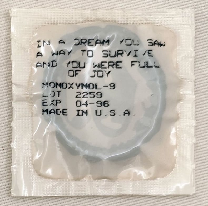 1996 Chez l’artiste, avant 1996 (date limite de vente), 35mm, monoxynol vert, sous emballage scellé portant imprimé la phrase: «In a dream you saw a way tu survive and you were full of joy» Parfait état.(104197) Couleur bleue.