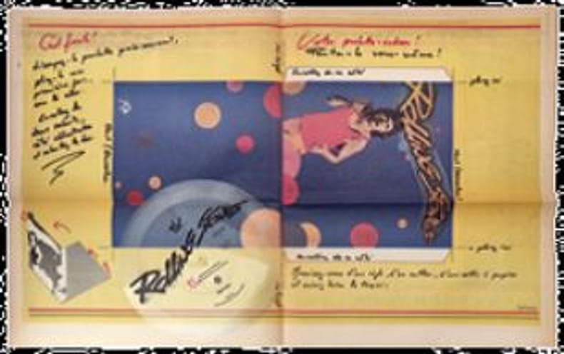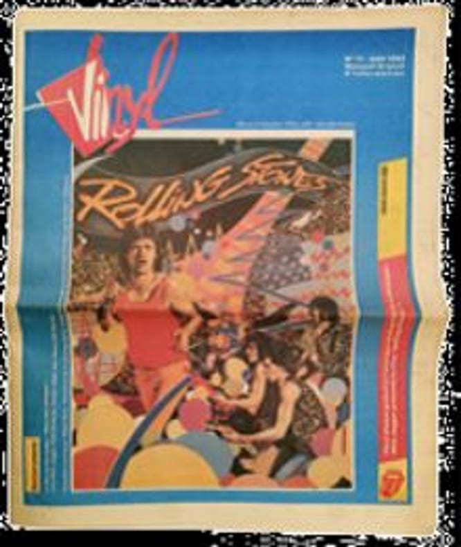 Paris, Vinyl n°11, juin 1983, 360x292mm, 20p., en feuilles.A l'occasion de la présentation chez Gaumont du film de Hal Ashby: "Rolling Stone", le mensuel gratuit "Vinyl" joint un flexi disque LVN 13214 fabriqué par Lyntone à Londres contenant la présentation du film par Mick Jagger: "Flip to play". Une double page centrale propose une pochette illustrée à monter soi-même.L'ensemble en parfait état. (105127)
