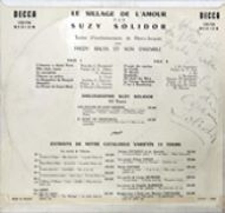 France, Decca, 133.726 Medium, 1957, 33trs, 25cm sous pochette illustrée.Belle dédicace saphique au dos : "Pour la plus belle pêche frisée l'admiration du Corsaire Solidor". (105138)