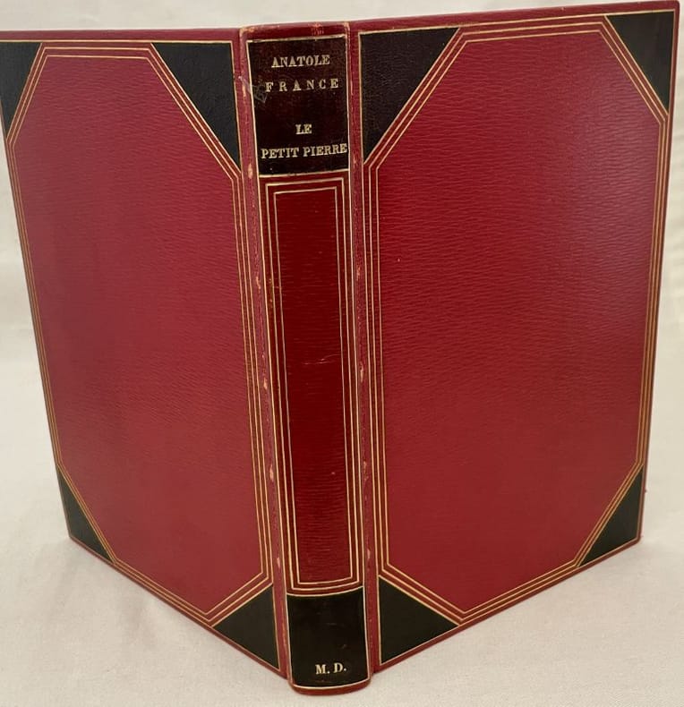Avec des gravures en couleurs de Pierre Brissaud. Les Editions d'Art Devambez, Paris, 1923-1924. In-8 gr., 2 opere in 2 volumi (in astuccio), legatura d'amatore in p. marocchino rosso, sottili cornici dorate ai piatti e al dorso a cordoni, con intarsi floreali in nero e a secco ai quattro angoli dei riquadri, dentelles dorate ai risg. (nello stesso stile), tagli super. dorati, conserv. le belle copertine originali in carta damascata azzurra con illustrazione di Brissaud.- 1° "Le petit Pierre", di pp. (8),289,(3), con 10 bellissime acqueforti a colori dell'artista Pierre Brissaud (una è la testata del primo capitolo), precedute da velina con didascalia. Tiratura di 535 esemplari numerati. Il ns., 288, fa parte dei 400 tirés sur vélin de Rives, contenant une suite en couleur des eaux-fortes. - 2° "La vie en fleur", di pp. (6),295,(3), con 10 bellissime acqueforti a colori dell'artista Pierre Brissaud (una è la testata del primo capitolo), precedute da velina con didascalia. Tiratura di 585 esemplari. Il ns., 140, fa parte dei 450 tirés sur vélin de Rives, contenant une suite en couleur des eaux-fortes.Cfr. Benezit,II, p. 819: Pierre Brissaud (1885-1964), peintre, graveur.. a illustré de nombreux ouvrages, dont: Le petit Pierre' et La vie en fleur' di Anatole France.. L'oeuvre di Brissaud, d'une facture élégante, était l'interpretation d'un certain dandysme contemporain.Esemplare in perfetto stato.