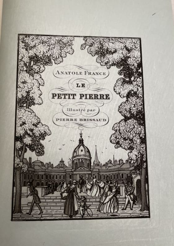 Anatole France est déjà âgé de 74 ans quand il livre avec précisions et un ton de confidence dans Le Petit Pierre (1918) ce qu'il a déjà auparavant évoqué dans Le Livre de mon ami (1885), puis dans Pierre Nozière (1899). Au contraire des deux premiers Le Petit Pierre se présente beaucoup plus riche en notations qui révèlent le caractère de l'auteur. « France nous y apprend que son esprit s'est modelé sur celui de son père, traditionaliste, spiritualiste et même chrétien, mais 'comme une coupe moulée sur le sein d'une amante' ! C'est-à-dire qu'il en reproduisit en creux les plus suaves rondeurs. Façon bizarrement poétique poétique d'exprimer qu'il prit en toutes choses contre-pied des opinions [...] de son éducateur ! ». Jolie provenance pour cet ensemble de souvenirs conservé dans une chemise-étui au nom de Paul Souday. Critique littéraire, ami de l'auteur, Souday est entre autre célèbre suite à la polémique qui l'opposa à Marcel Proust auquel il reprocha dans une tribune du Temps (10 décembre 1913) les «fautes de français» dans Du côté de chez Swann... L'histoire dit que l'auteur de la Recherche lui pardonna, qu'ils devinrent même amis et que ce qui les avaient fâchés devint un sujet de plaisanterie. Des bibliothèques Paul Souday puis Lucien Graux (ex-libris).