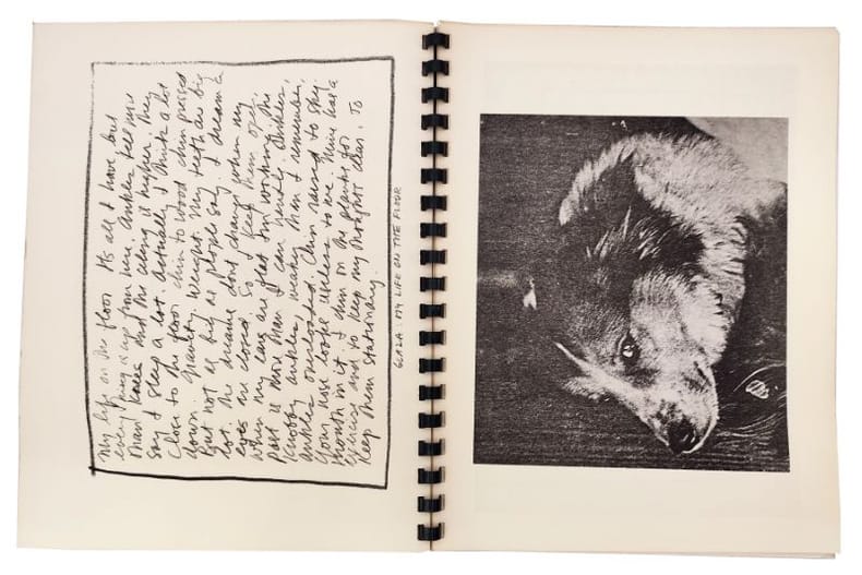 New York, Buffalo Press, 1974, 223x281mm, 20p., reliure peigne plastique noir, couverture imprimée. Reproductions de photographie de son chien en regard de textes de l'auteur en fac-similé de son écriture. Défauts sans manque sur deux coins. (105323)