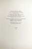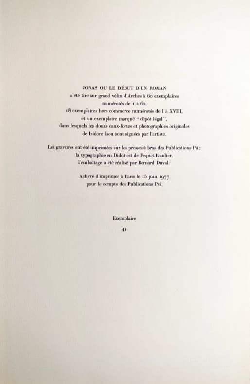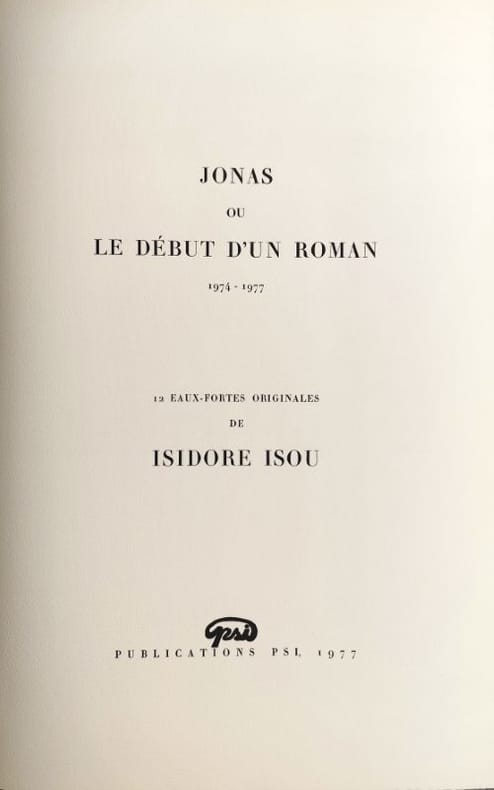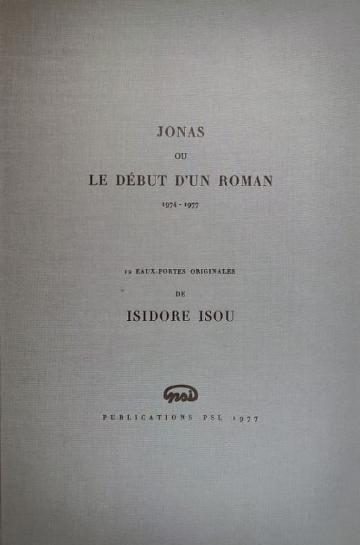 1977 Couverture souple Paris, Publications PSI, 1977. Un volume in folio (50 x 32,5 cm), en feuilles sous un portfolio de l'éditeur titré et entoilé, portfolio à rabats, quelques marques fines et marginales au portfolio. Feuillet de titre, 12 eaux-fortes originales de l'artiste sous serpente, toutes justifiées et signées par l'artiste à la mine de plomb, feuillet de justification du tirage. Tirage à 78 exemplaires, le nôtre un des 60 exemplaires numérotés sur grand vélin d'Arches. Les gravures ont été imprimées sur les presses à bras des publications Psi, la typographie en Didot est de Fequet-Baudier, l'emboîtage a été réalisé par Bernard Duval. Achevé d'imprimer le 15 juin 1977. Isidore Isou est le fondateur (avec Gabriel Pomerand) du lettrisme, mouvement qui repose sur l'idée de dépasser les formes traditionnelles de l'art en utilisant les lettres, les signes et les sons comme matériaux de base, plutôt que les mots ou images conventionnelles. "Jonas ou le début d'un roman" s'inscrit dans la série des "romans hypergraphiques" d'Isou, qui repoussent les limites du roman traditionnel en associant gravure, dessin, photographie et texte. Ce titre a été exposé dans le cadre de rétrospectives consacrées à Isou, notamment à l'Institut culturel roumain de Stockholm en 2012. Bel état des planches, bel exemplaire.