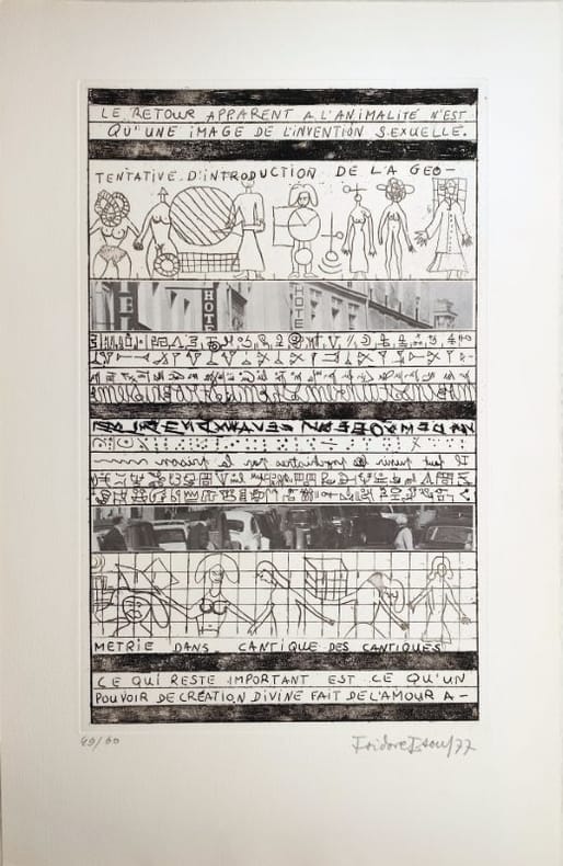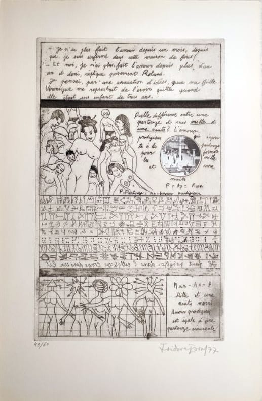 Intéressante mise en page des eaux-fortes : d'un côté, le texte (dont le sujet est une journée dans une division de l'asile d'aliénés St Anne à Paris) rédigé en hypergraphie (où le texte côtoie des signes et des dessins), de l'autre, des photographies contrecollées. Ce texte courant sur 12 pages sera édité en 1984 aux éditions Gérard Philippe Broutin augmenté de 30 pages sous le titre "Jonas ou le corps à la recherche de son âme".Parfait état. Neuf