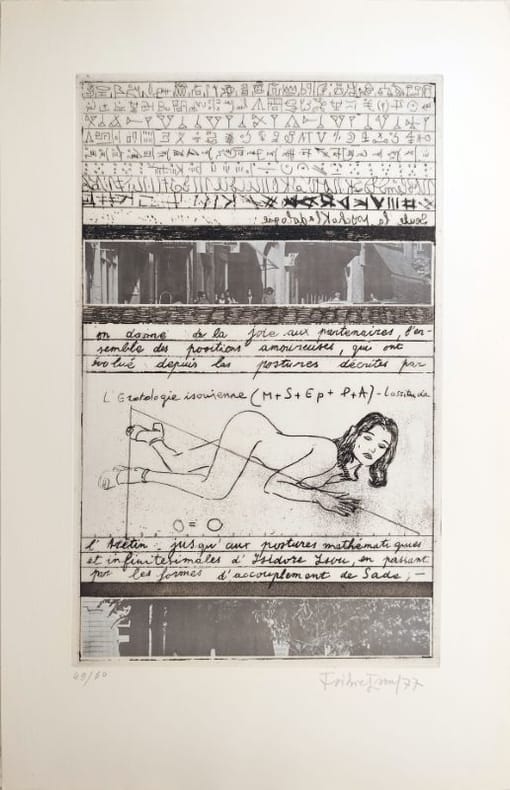 1977 Paris, Publications PSI, 1977, 500x325mm, 4f., 12 planches, en feuilles sous portefeuille éditeur de toile gris bleu.Portfolio tiré à 78 exemplaires (60 exemplaires sur Arches + 18 H.C.) : un des 60 exemplaires sur grand vélin d'Arches comportant 12 eaux fortes originales d'Isidore Isou justifiées et signées.