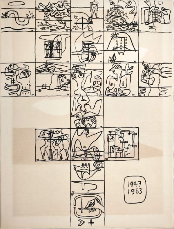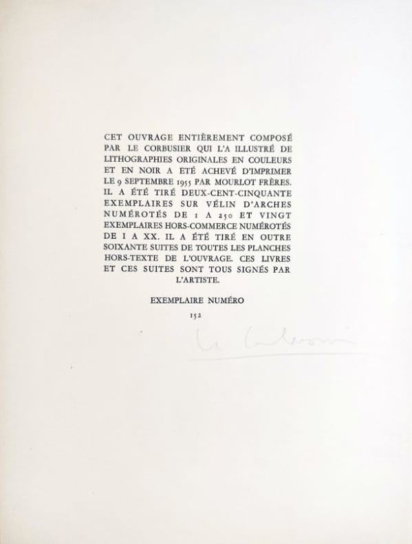 Livre conçu et composé par Le Corbusier entre 1948 et 1952, s’inscrivant dans la série des grands livres manuscrits et illustrés par des artistes, tels que le Jazz de Matisse ou le Cirque de Léger.Le Corbusier réalisa la majorité des illustrations avant de commencer à écrire les poèmes, l’impression fut confiée à Mourlot.20 lithographies originales en couleurs à pleine page, dont la couverture, et 70 compositions en noir en marge du texte.Édition limitée à 270 exemplaires, tous sur Velin d’Arches, numérotés et signés par l’artiste au colophon.Bel exemplaire de toute fraîcheur, quelques reports légers sur certains vis-à-vis.Le Corbusier et le livre p.147 ; Le Corbusier, Un architecte et ses livres, p.56, 124. (105488) Très bon