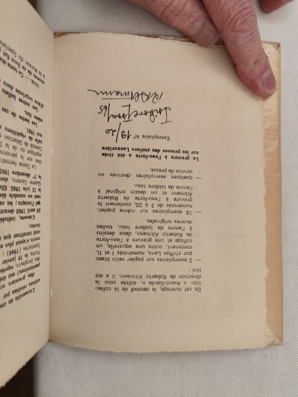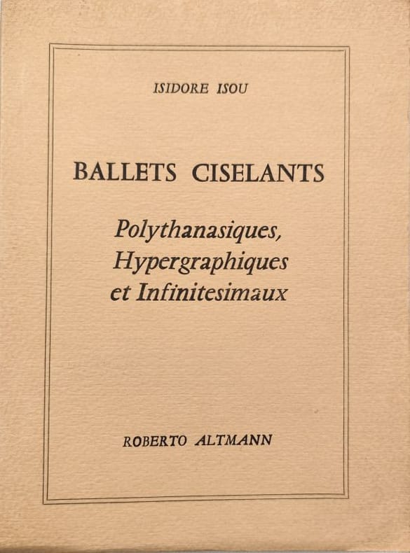 Édition en partie originale de ces ballets d'Isidore Isou. La totalité d'entre eux ont été représenté lors de la soirée du 4 février 1965 à la Maison du spectateurÉdition originale du second ouvrage paru dans la collection Avant-Garde dirigée par l'artiste Roberto Altmann.Un des 18 exemplaires sur vélin blanc de Lana, signés de l'auteur et de l'artiste, contenant une gravure à l'eau-forte signée de Roberto Altmann et un dessin original à l'encre signé d'Isidore Isou.Exemplaire tel que paru parfaitement conservé. (105493)