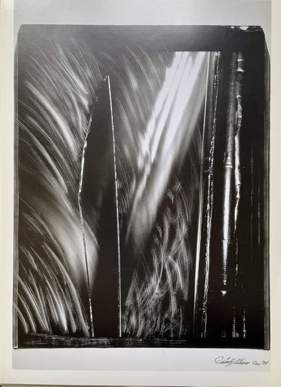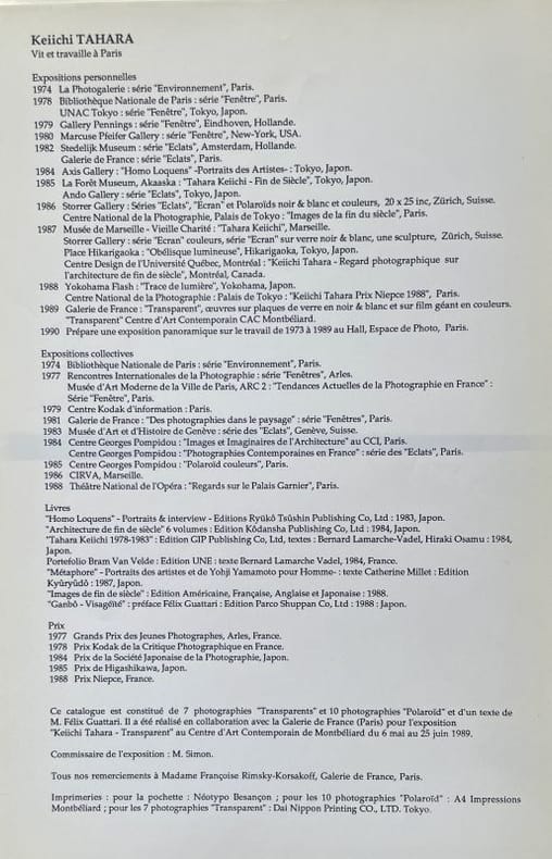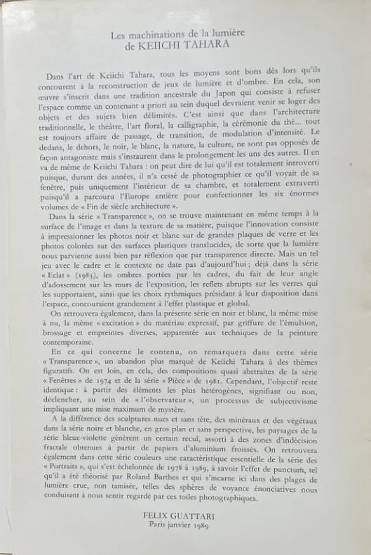 1989 2 Montbéliard, Centre d'Art Contemporain, 6 mai-25 juin 1989, 306x215mm, une feuille de biographie, 10 planches de photographies "Polaroïd", 7 planches de photographies "Transparent", l'ensemble logé dans une chemise titrée, et comportant un texte original de Felix Guattari "Les machinations de la lumière de Keiichi Tahara", imprimé sur le deuxième rabat, daté de janvier 1979.Exemplaire signé par le photographe sur un des transparents, chemise un peu usagée.
