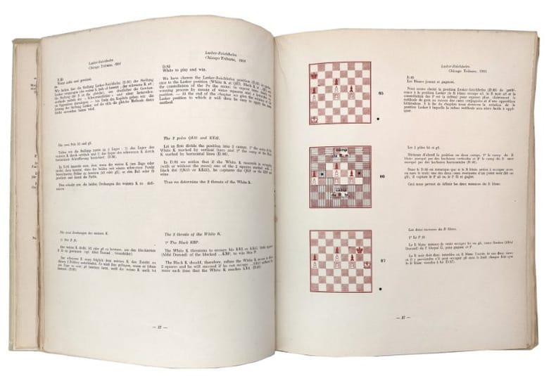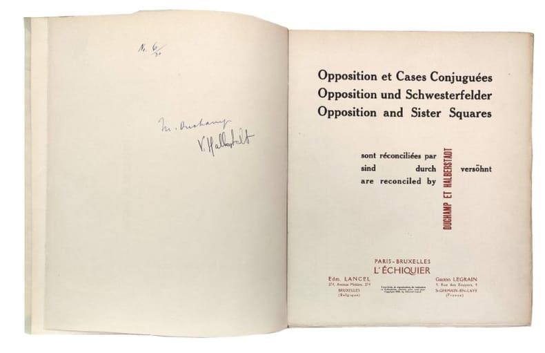 Paris/Brussels: Edition de l’Echiquier, 1932, 28x24.4cm, 112pp., 259 diagrammes, couverture cartonnée titrée.Diagrammes imprimés en rouge et noir, dont 8 pleine page sur papier transparent, texte en français, anglais et allemand, couverture et conception graphique de Marcel Duchamp.