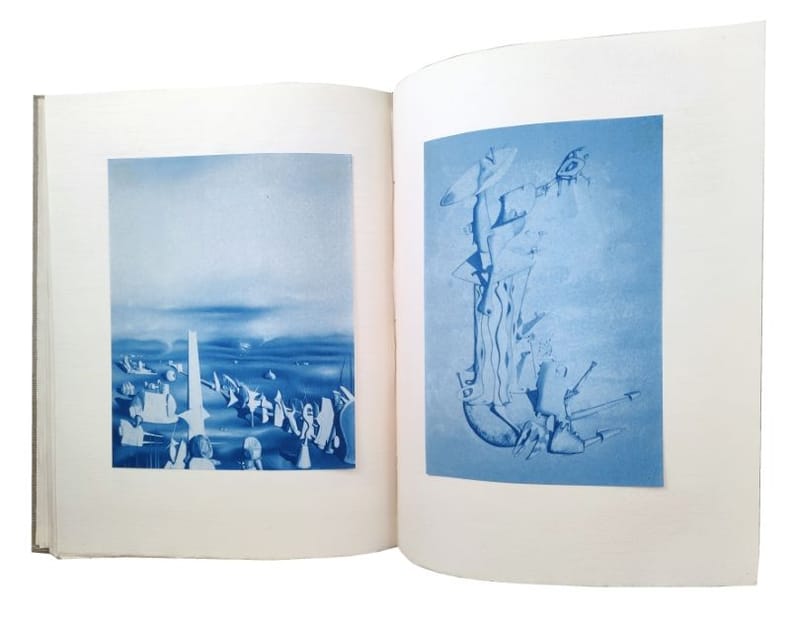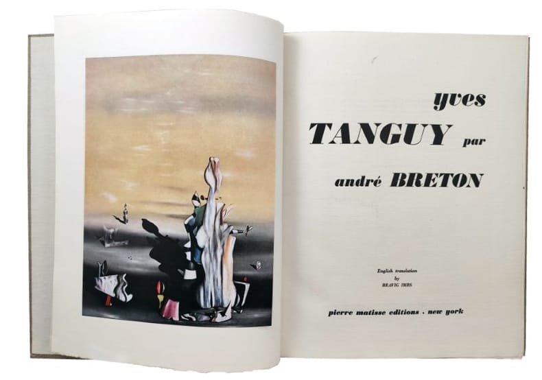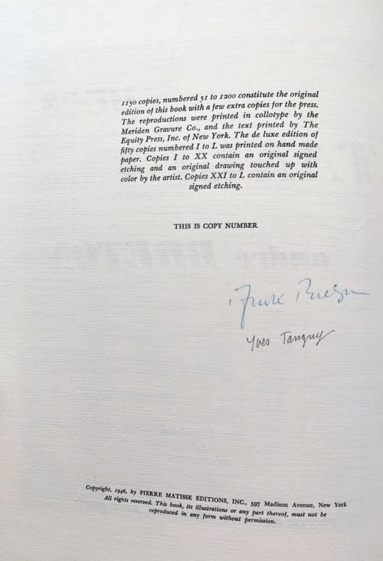 Texte d'André Breton en français et anglais (traduction par le poète Bravig Imbs). Tirage de 1150 exemplaires.L'illustration se compose de deux hors-textes en couleur, en frontispice et en p.52 , 33 reproductions pleine page, 19 dessins dans le texte et trois photographies.Exemplaire de luxe, d'un format légèrement supérieur, signé au colophon par Breton et Tanguy, non numéroté et ne comportant pas les suppléments accompagnant les exemplaires de tête mais dans la reliure spéciale réservée à ces exemplaires et comportant une gaze appliquée (tarlatane) sur les plats et au dos, et un étui muet. Schwarz 516. (2807.5) (105537)