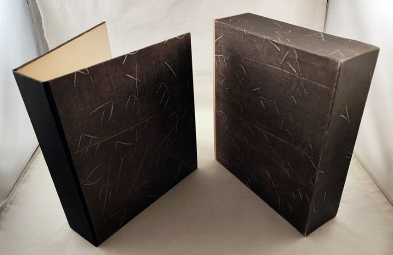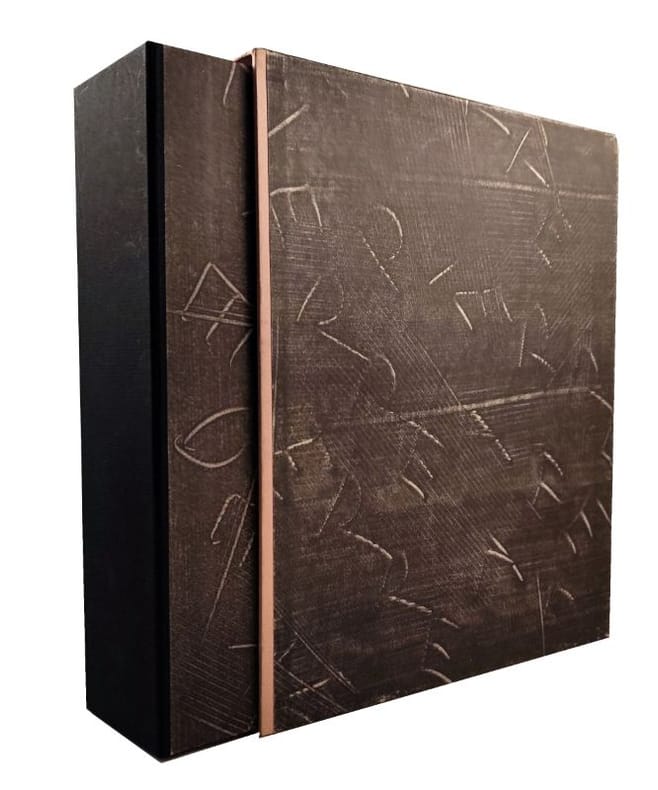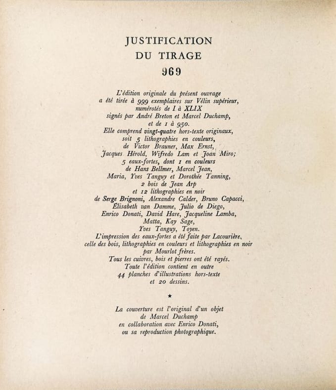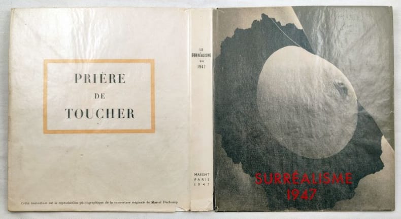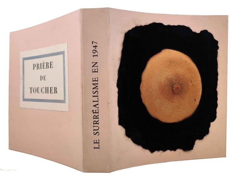 Paris, Pierre à Feu, 1947, 240x205mm, 142 pp., broché sous couverture photographique reproduisant la photographie d'un sein féminin entouré de velours noir, glassine originale imprimée en rouge, sur-couverture en carton rose portant au recto l'objet-sein de Marcel Duchamp et Enrico Donati et au verso l'étiquette "Prière de toucher"; cet objet fut réalisé à partir de deux moulages en plâtre d'un sein dont Maria Martins fut le modèle. (Schwarz 521 et 522).L'ensemble est contenu dans une étui-chemise de l'éditeur réalisé par Maeght en 1989 qui y a apposé une étiquette explicative.