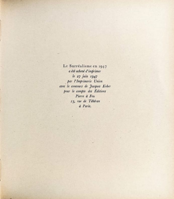 Paris Editions Pierre à Feu / Maeghet Editeur 1947, 20 x 24 cm, broché, 139p. Année de l'édition originale, sur papier courant. La couverture est la reproduction photographique par Rémy Duval de la couverture originale de Marcel Duchamp. Bon état.