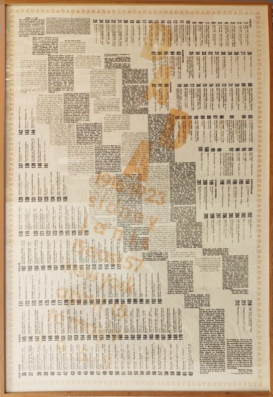 L'exposition Dada à la Galerie Sydney Janis, ainsi que le catalogue et l'affiche, furent entièrement conçus et organisés par Marcel Duchamp. Pour cette première rétrospective Dada après-guerre, Duchamp frappa les esprits. L'affiche imprimée en rouge et noir sur papier pelure était distribuée froissée en boule.En 1953, Duchamp planifia, organisa et installa une importante exposition historique de dadaïsme international à la galerie Janis. Plus de deux cents œuvres et documents y étaient présentés, chacun identifié dans un « catalogue » conçu par Duchamp, véritable œuvre dadaïste en soi : une feuille volante d'une extrême finesse, ornée de textes (de Jean Arp, Richard Huelsenbeck, Jacques-Henri Lévesque et Tristan Tzara) en caractères typographiques contrastés, disposés en colonnes étroites en diagonale. À la réception des feuilles, Duchamp en prit une, la froissa en boule et demanda à Janis de l'expédier telle quelle. Janis s'exécuta, à la grande surprise de nombreux amateurs d'art qui se demandaient pourquoi on leur envoyait des déchets.L'exemplaire proposé ici a cependant été envoyé pliée et l'enveloppe originale est jointe.Bon état, les parties imprimées en rouge ayant pâli avec le temps.MOMA 1973 p.325; Schwarz 543.(105539)