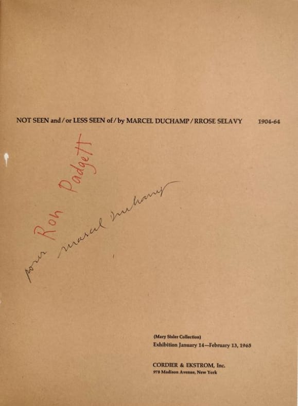 Catalogue des 125 œuvres exposées comportant 67reproductions dans le texte, 4 photographies et 4 planches en couleurs hors texte, réalisé par Richard Hamilton. Couverture gaufrée de Marcel Duchamp reproduisant la porte du 11 rue Larrey. Exemplaire du premier tirage avant les modifications exigées par Mary Sisler, propriétaire de la collection. Exemplaire dédicacé au poète et critique Ron Padgett par Marcel Duchamp. Petites rousseurs en couverture sinon bel état. Chemise et boîte ouvrante titrée au dos. Schwarz n°616 (376) (2807.19) (105555)