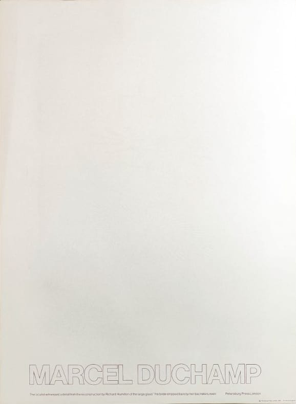 Londres, Petersburg Press, 1968, affiche 800 x 586mm, sérigraphie sur papier fort, avec parties vernies et gaufrées d’argent.Portrait photographique de Marcel Duchamp par Richard Hamilton, affiche de couleur verte avec gaufrage représentant le Les témoins oculistes du Grand Verre.Texte imprimé au verso: 'MARCEL DUCHAMP The 'oculist witnesses' a detail from the reconstruction by Richard Hamilton of the large glass 'The bride stripped bare by her bachelors, even' Petersburg Press London' Petersburg Press London 1968 Printed in England.Etienne Lullin, Richard Hamilton: Prints & Multiples 1939-2002, Miscellaneous, p. 264.(105557)Très bon état.
