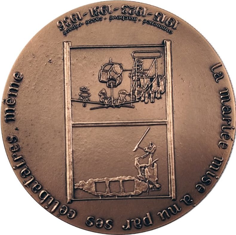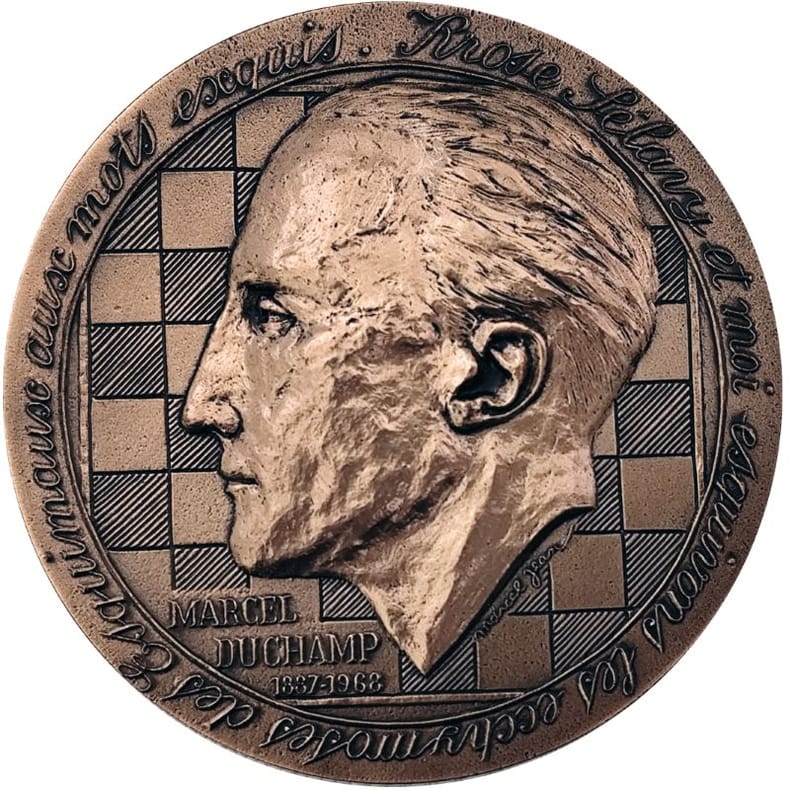 Paris, Monnaie de Paris, 1977, Médaille en bronze de 72mm, 186,31 g., poinçon «corne bronze» sur la tranche, Avers: portrait de l’artiste de profil gauche se détachant sur fonds d’échiquier titré: Rose Selavy et moi esquivons les ecchymoses des Esquimaux Aux Mots Exquis // Marcel / Duchamp / 1887-1968 . Revers: une reproduction du «Grand Verre», signé dans la frappe Marcel Jean. Légendé: La mariée mise a nu par ses célibataires, même // commencé - inachevé - cassé - réparé / 1915-1923-1931-1936. Neuf dans la boîte d’édition.(105566)